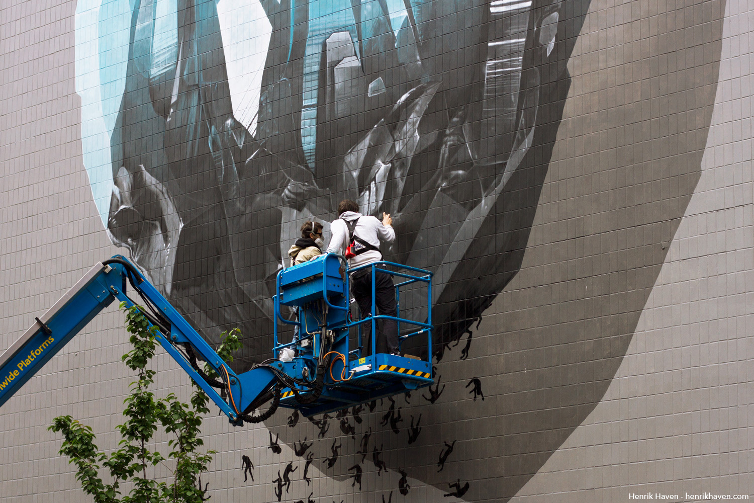 “Inhuman barriers” - Mural painting that addresses the theme of immigration realized for “Cities of hope” in Manchester (UK), in support to the local solidarity group WASP (Women Asylum Seekers Together), 2016.