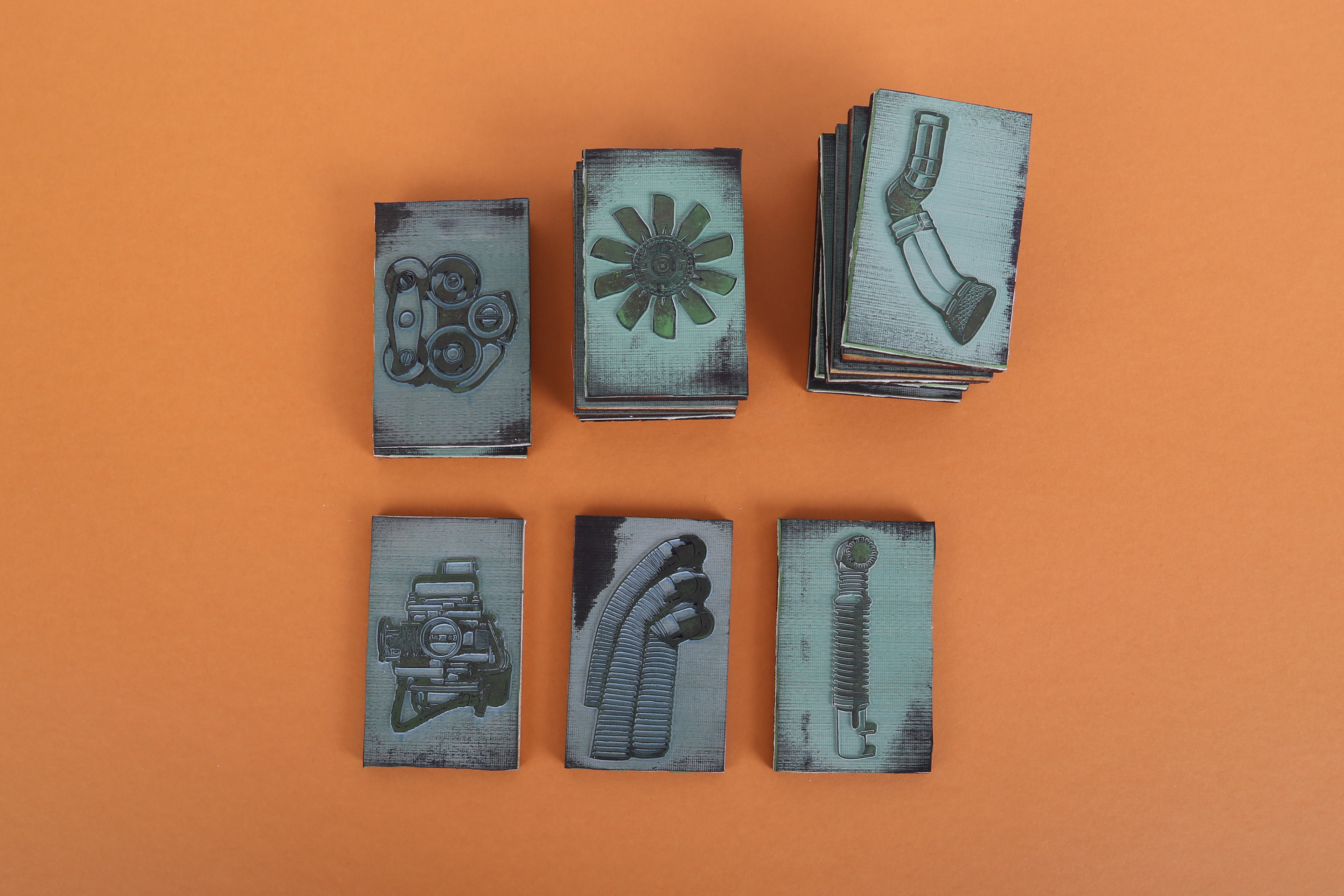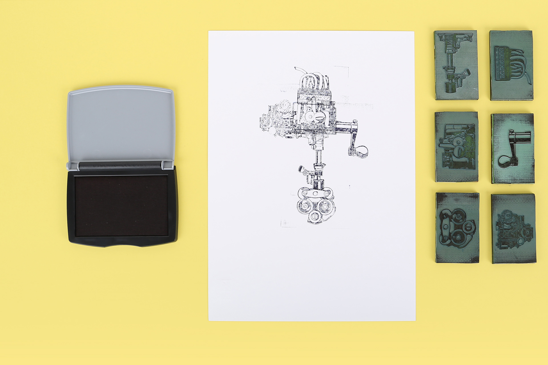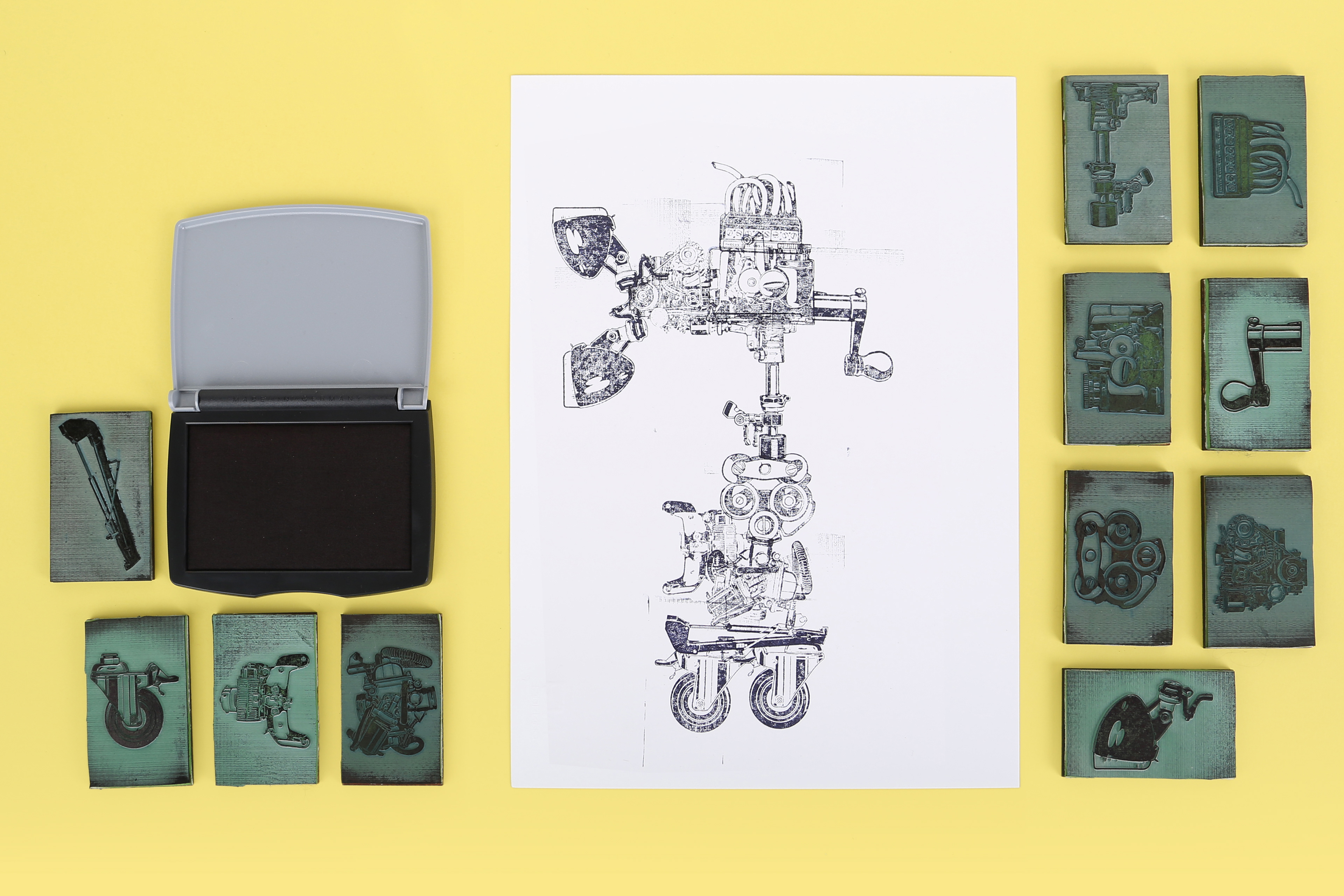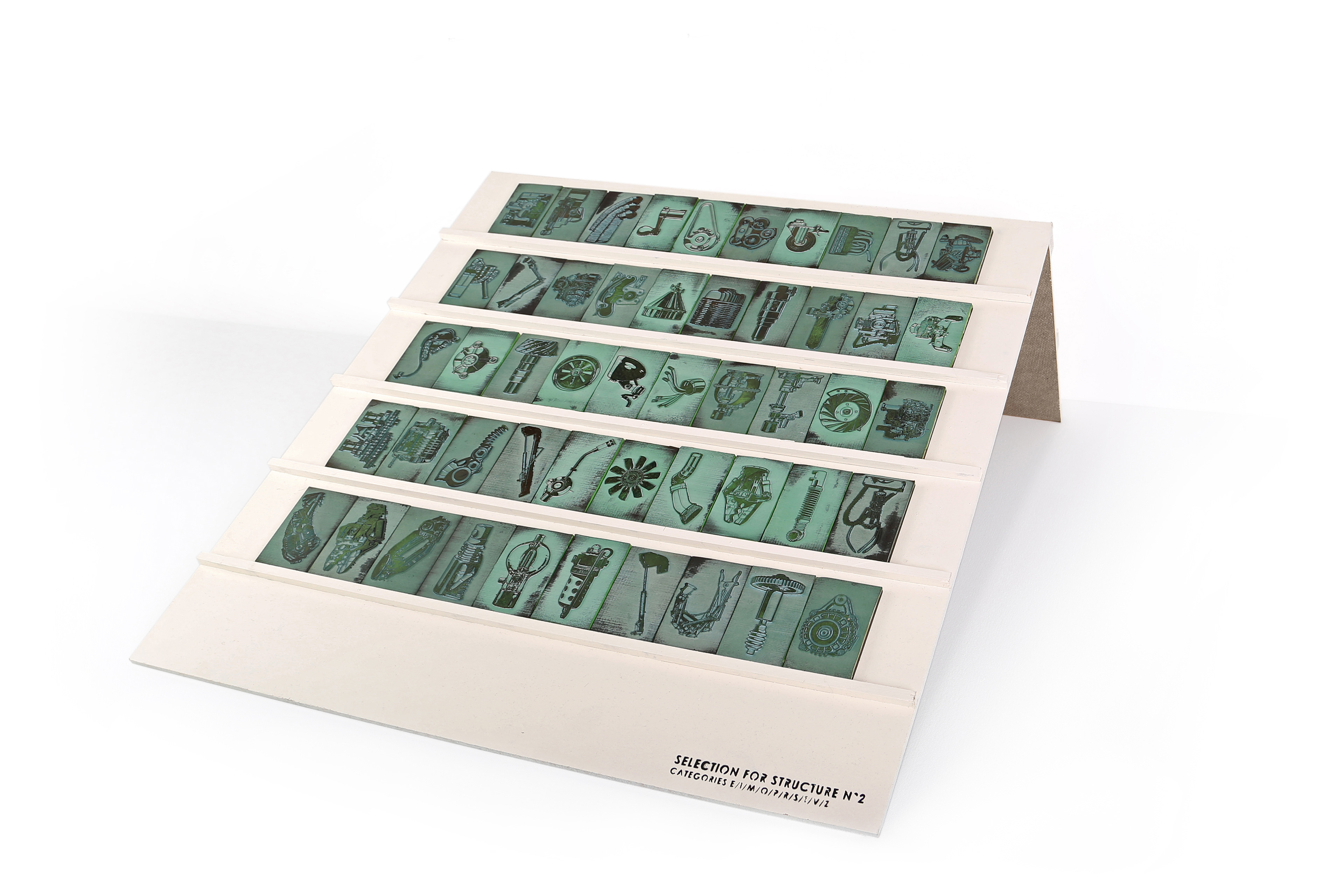 "Selection for structure n°2" - Interactive installation with rubber stamps. 50 stamps of 50 parts to assemble in infinite machines, as a shareable vision of our concepts of composition and communication, 2013.