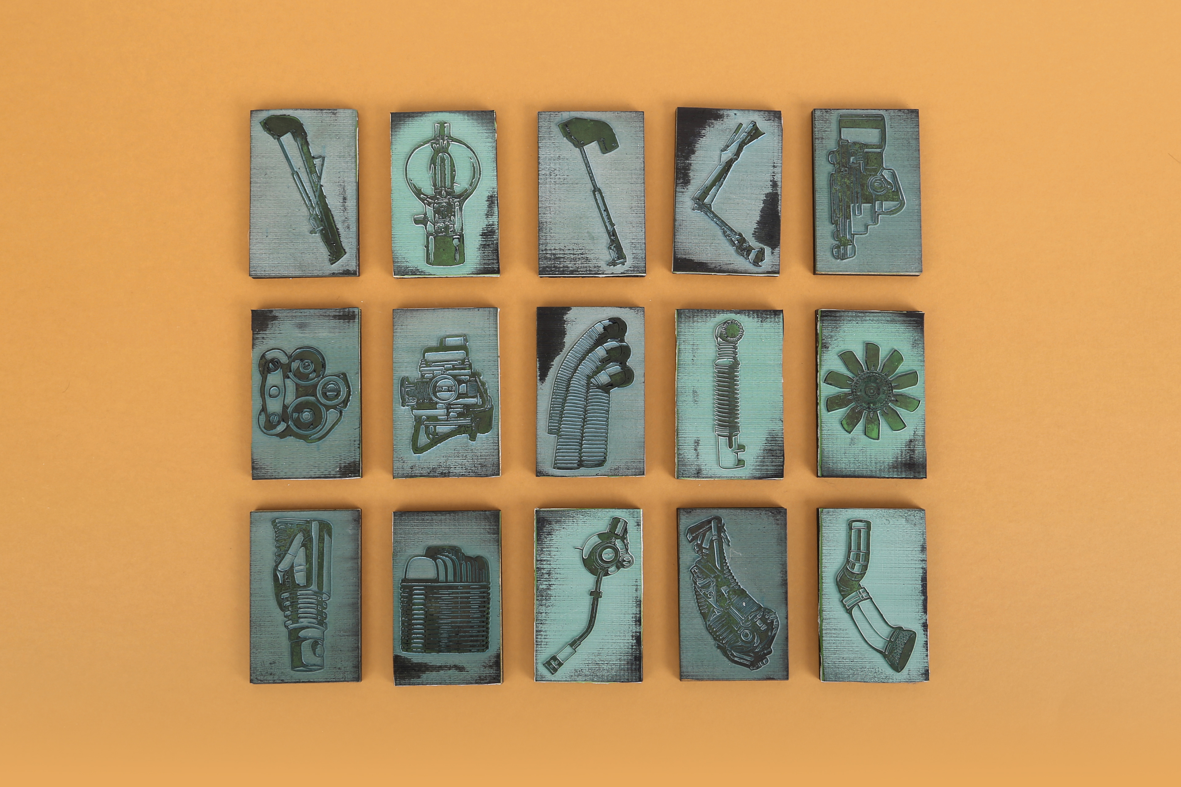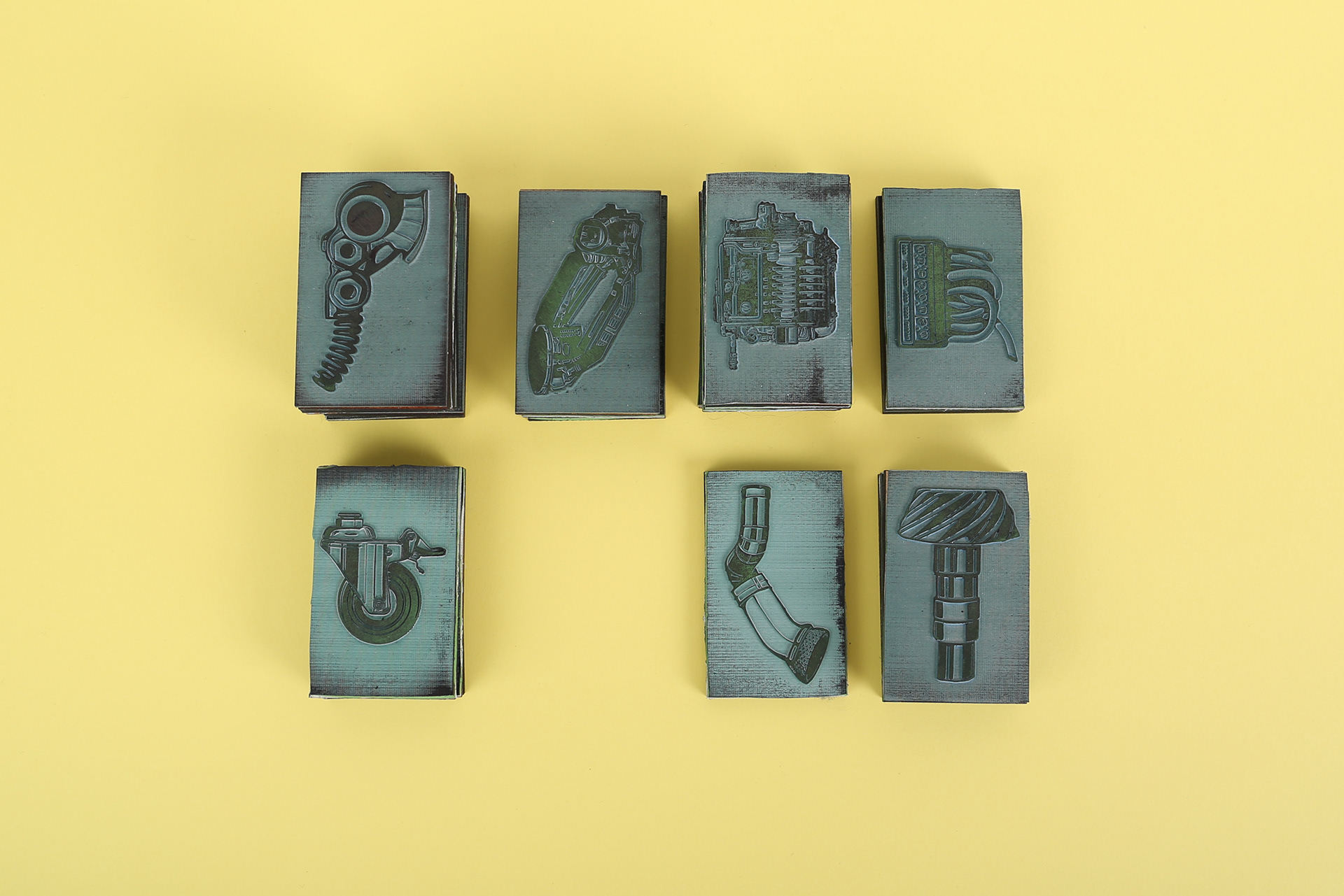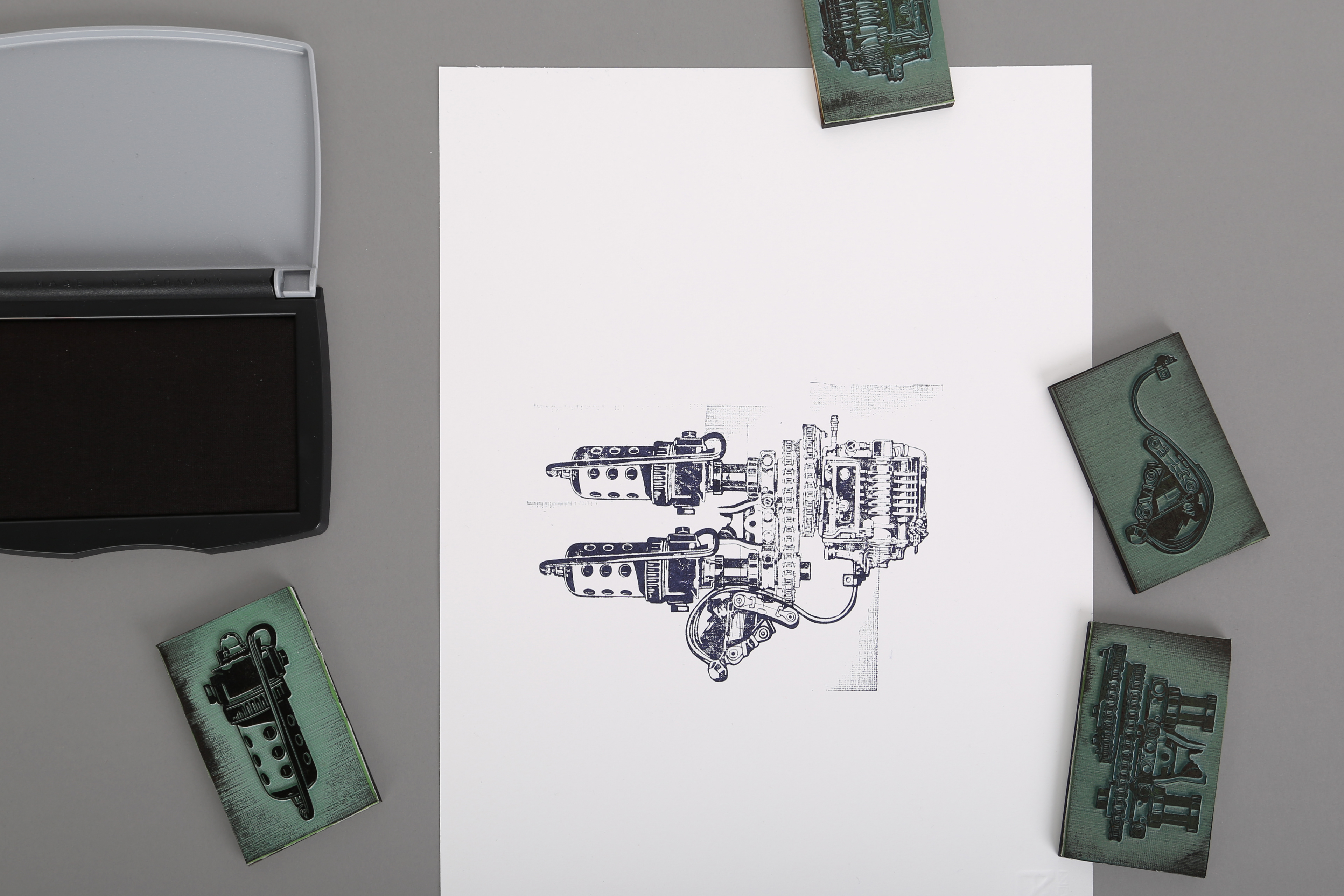 "Selection for structure n°2" - Interactive installation with rubber stamps. 50 stamps of 50 parts to assemble in infinite machines, as a shareable vision of our concepts of composition and communication, 2013.