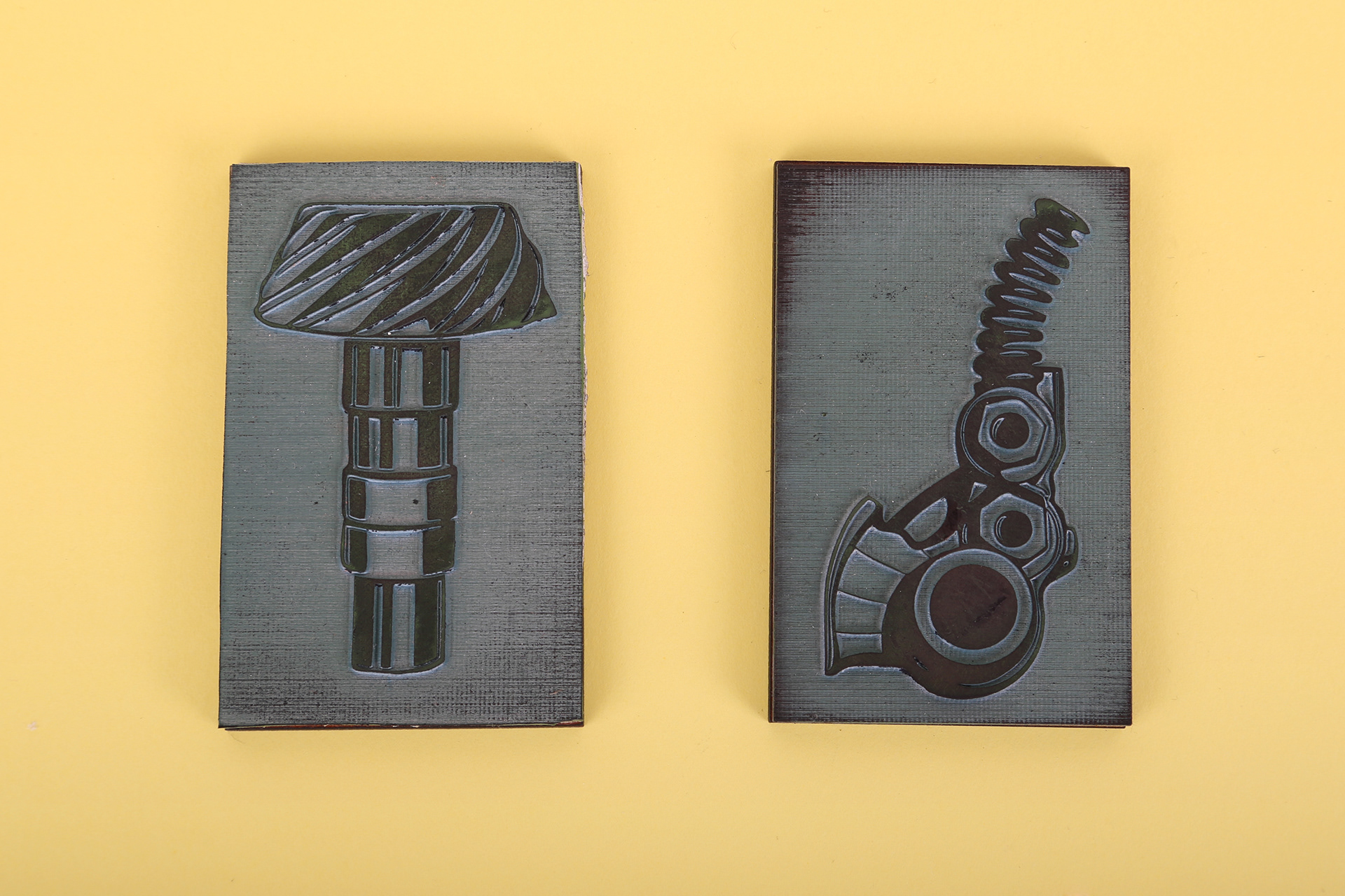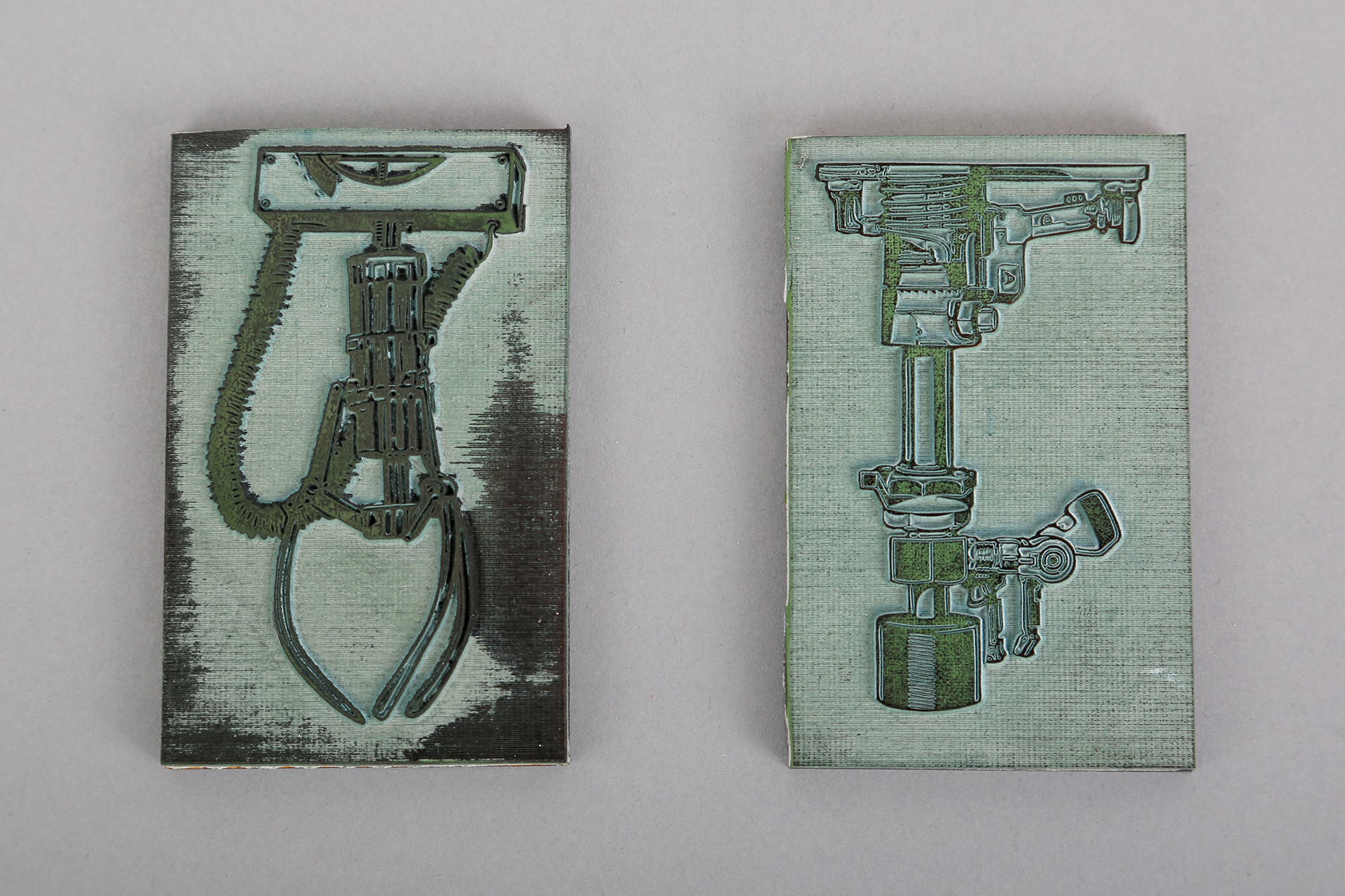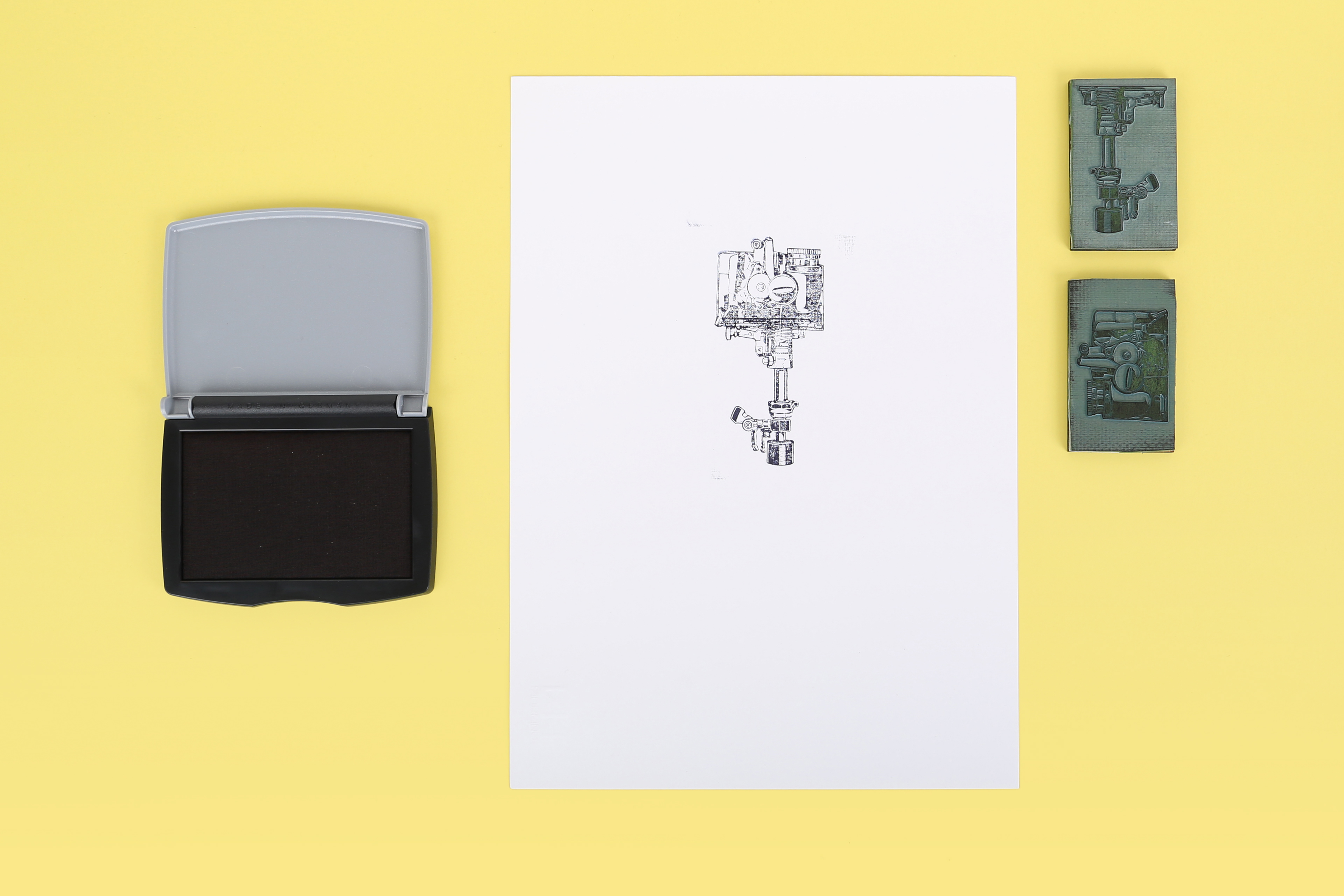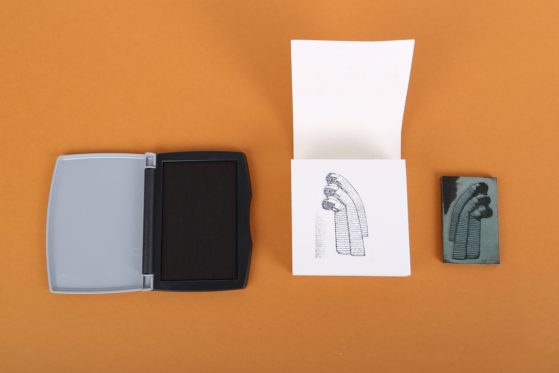 "Selection for structure n°2" - Interactive installation with rubber stamps. 50 stamps of 50 parts to assemble in infinite machines, as a shareable vision of our concepts of composition and communication, 2013.