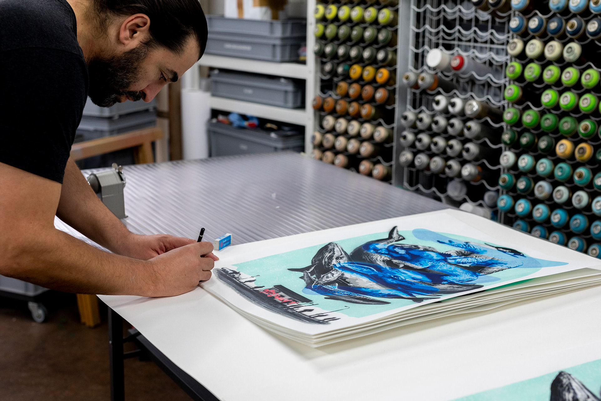 "Shine" - Handmade stencils print realized for our solo show “MUTUAL” at Artrust Gallery Zurich, inaugurated on the 26th of October 2023. The print is an edition of 20 pieces, 70 x 50 cm, made with 15 layers of spray paint and stencils on paper (2023).